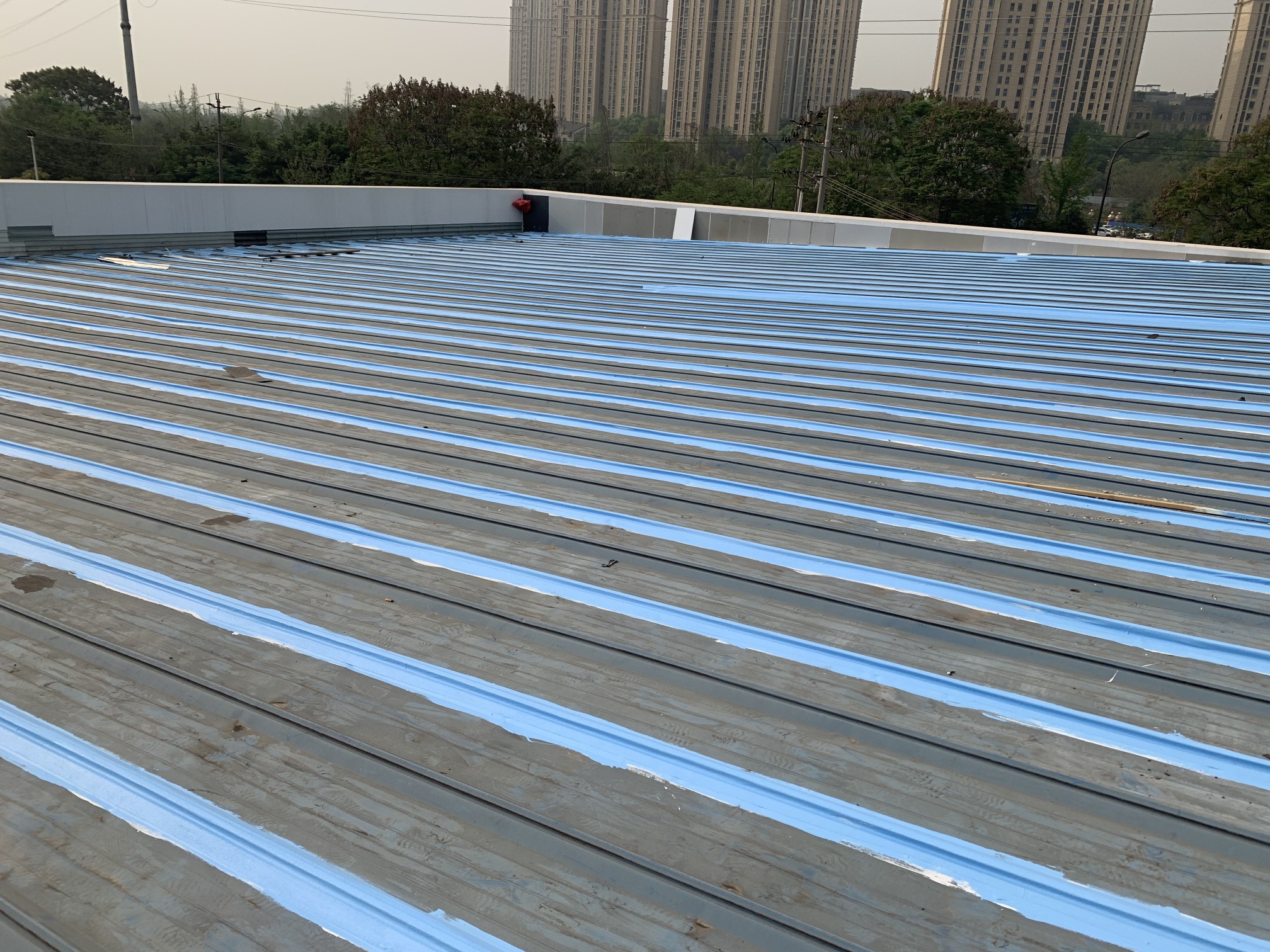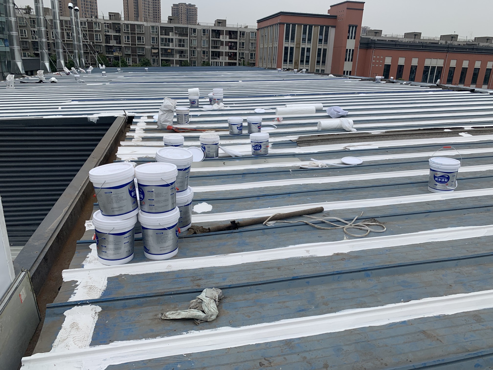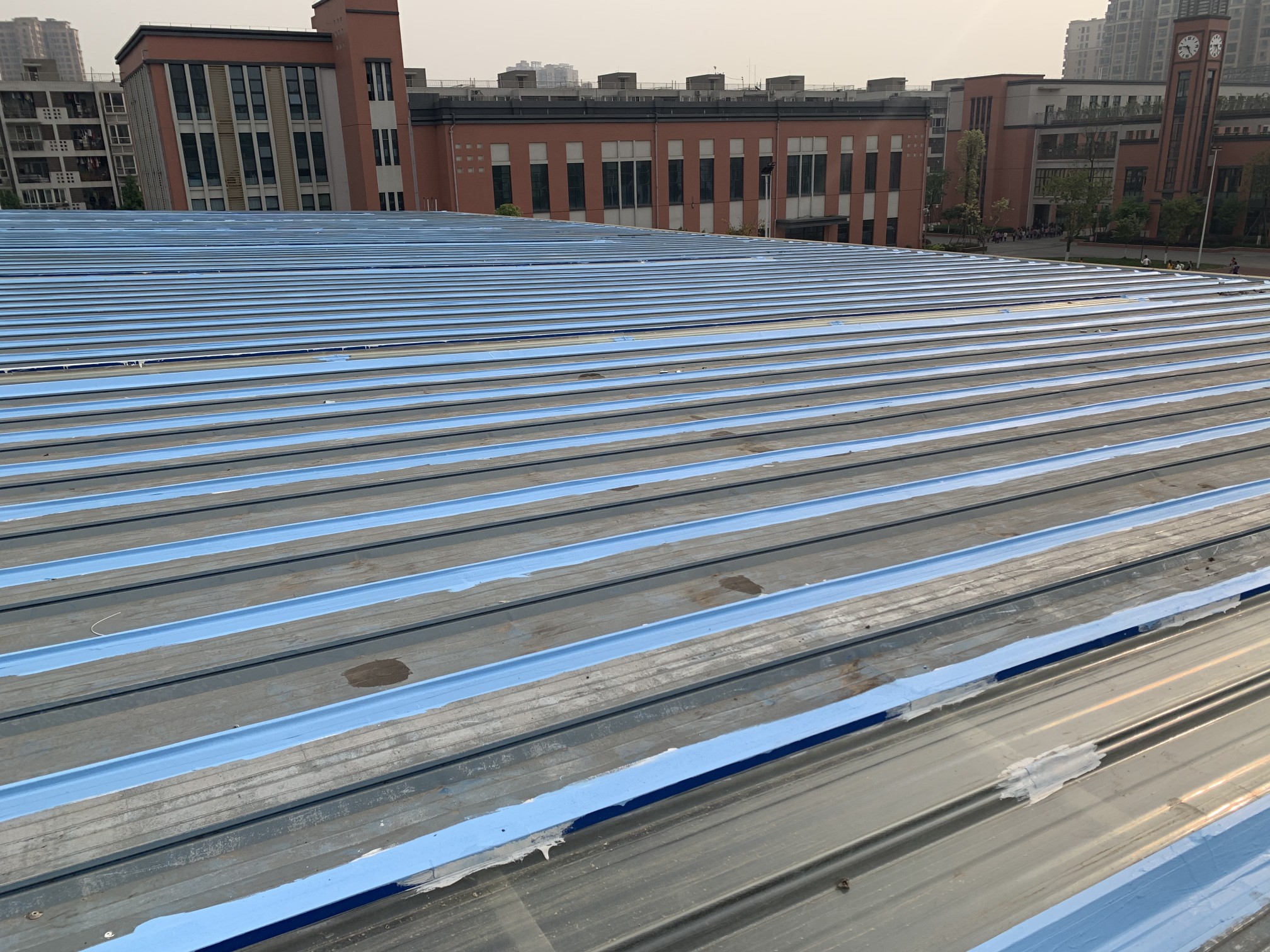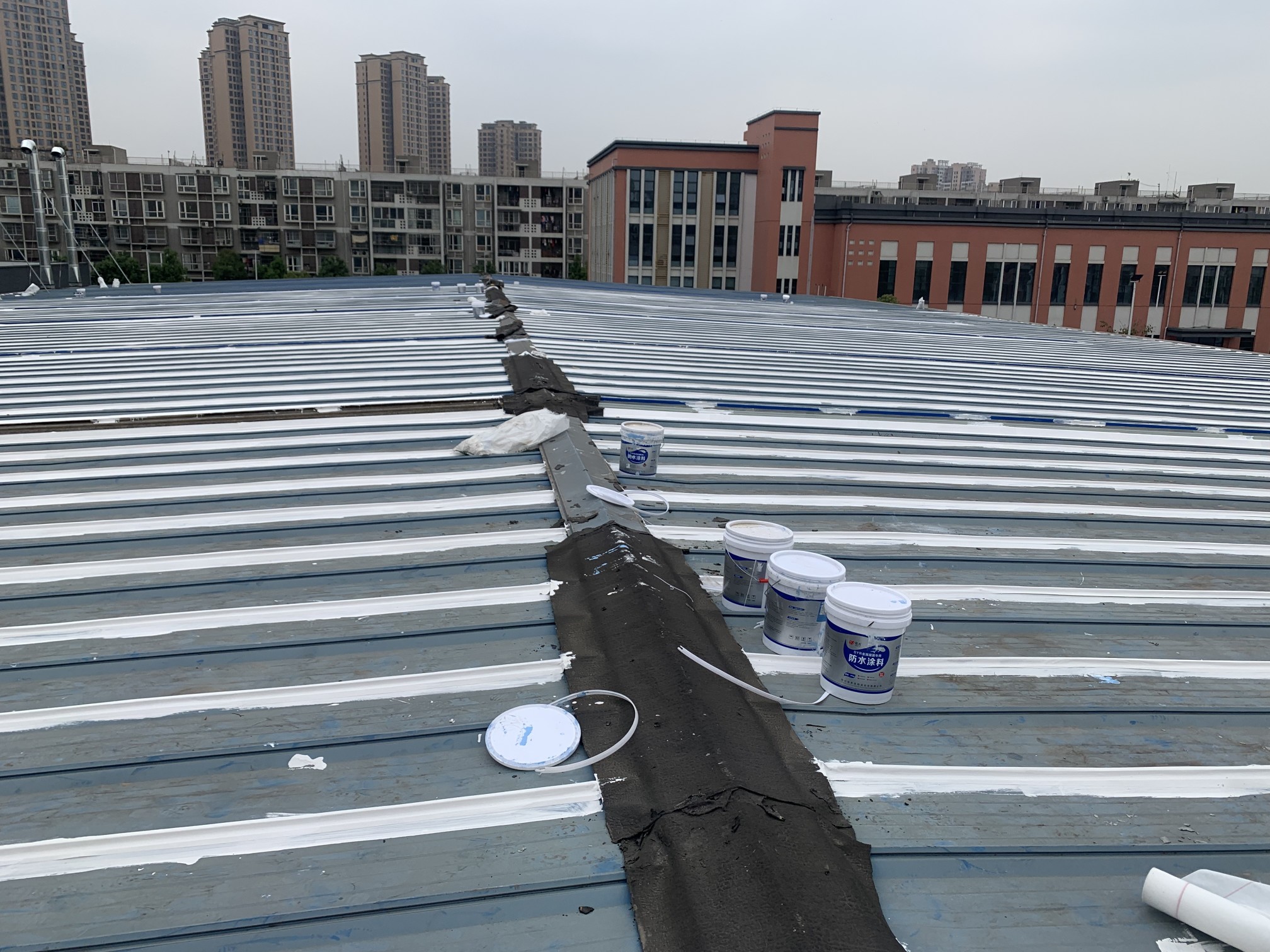 成都市新都區下石橋路啟陽五龍山園區鋼結構彩鋼頂屋面防水補漏由成都蜀禹建筑防水工程有限責任公司施工,采用的蜀禹SYR金屬屋面專用防水涂料配合專用縫織聚酯布進行施工處理的,施工處理后具有防水防腐等多重功能。
