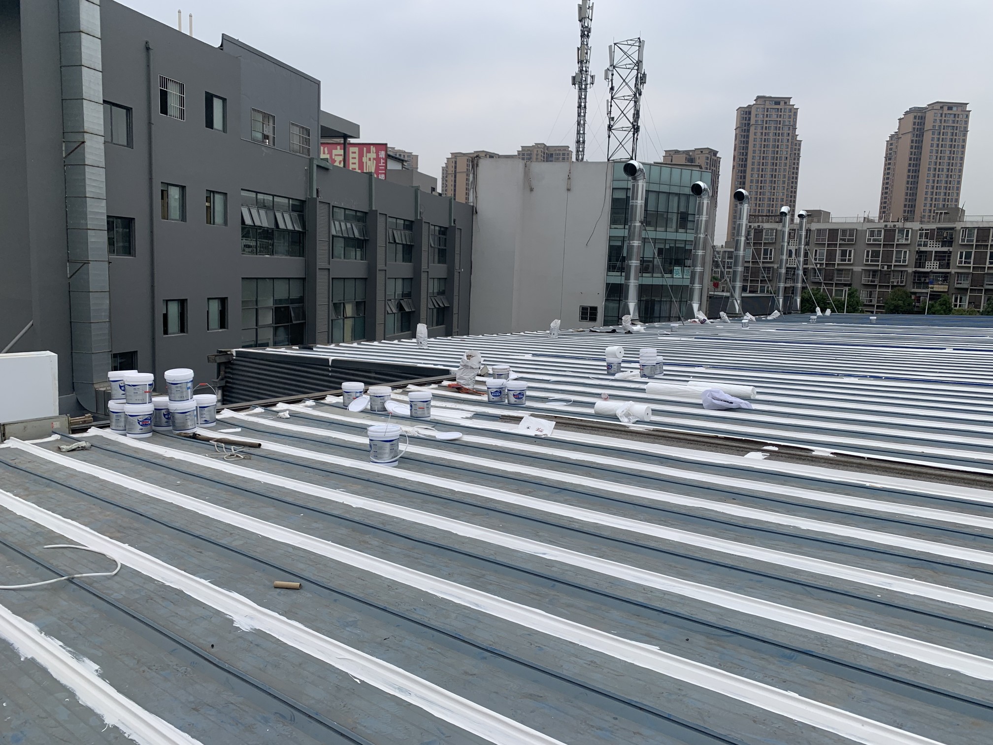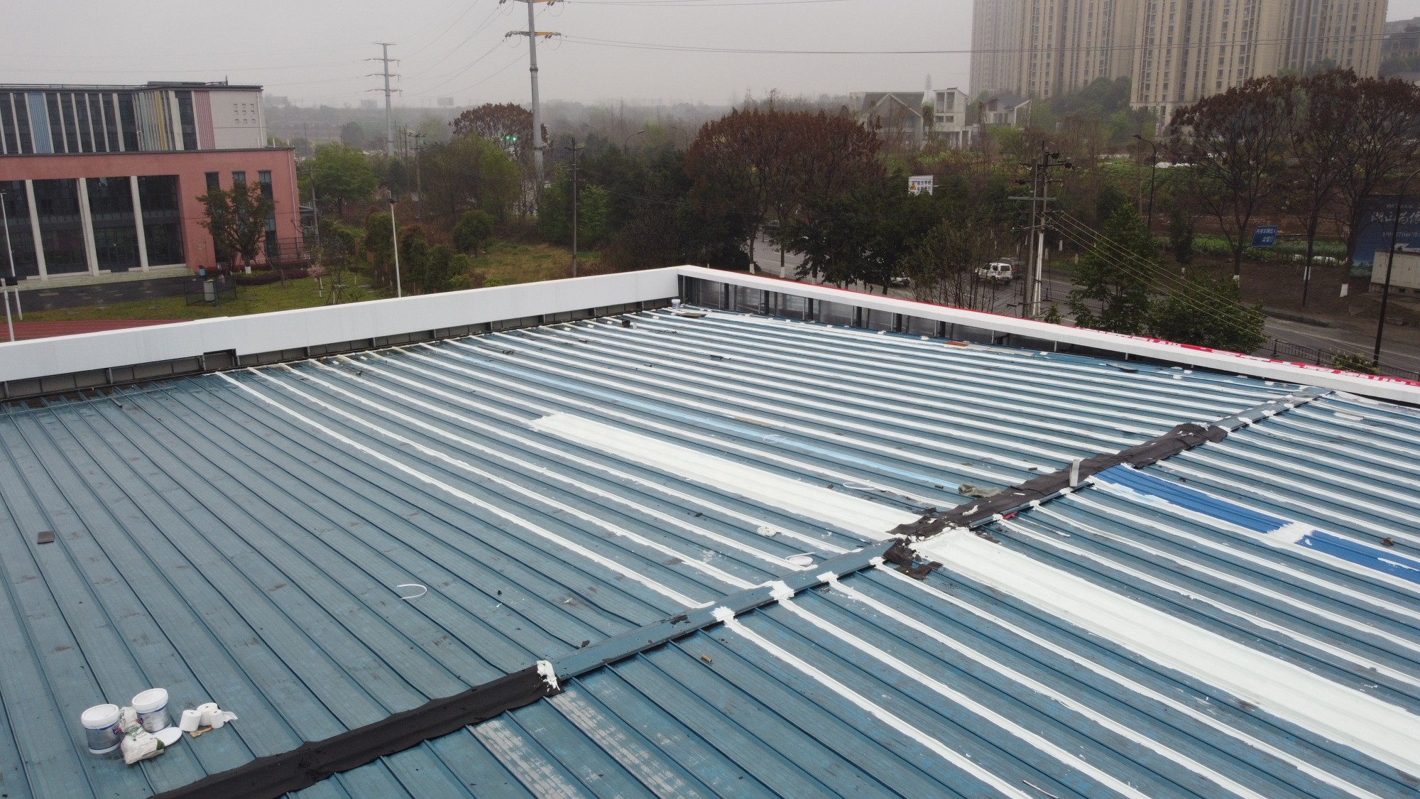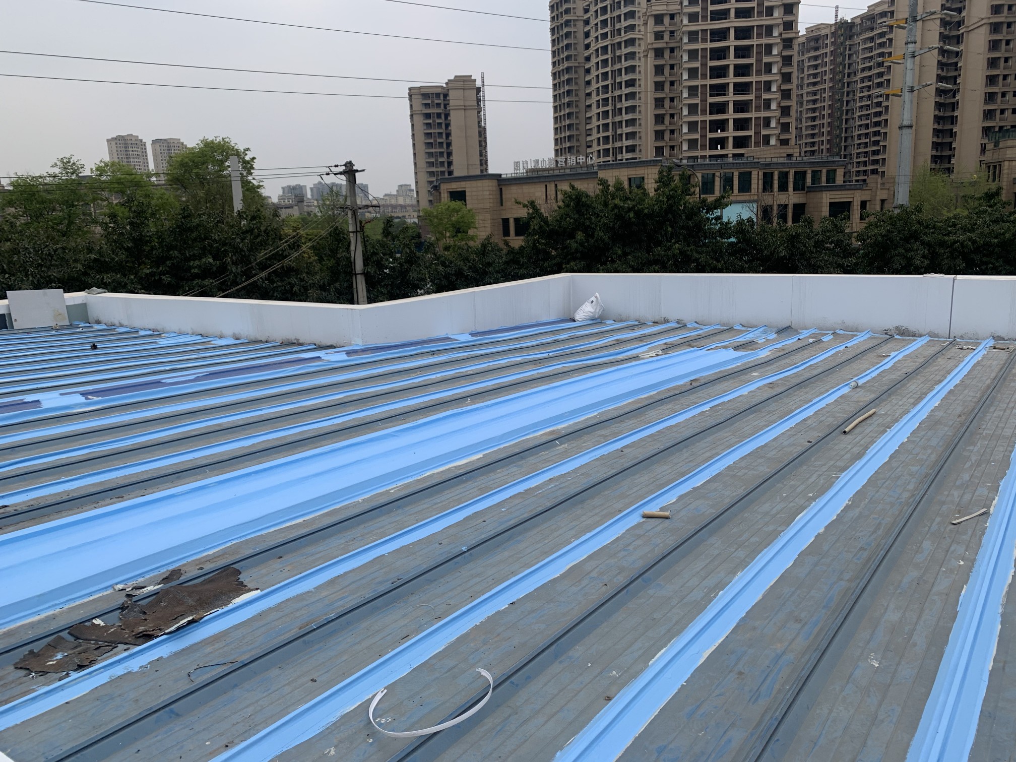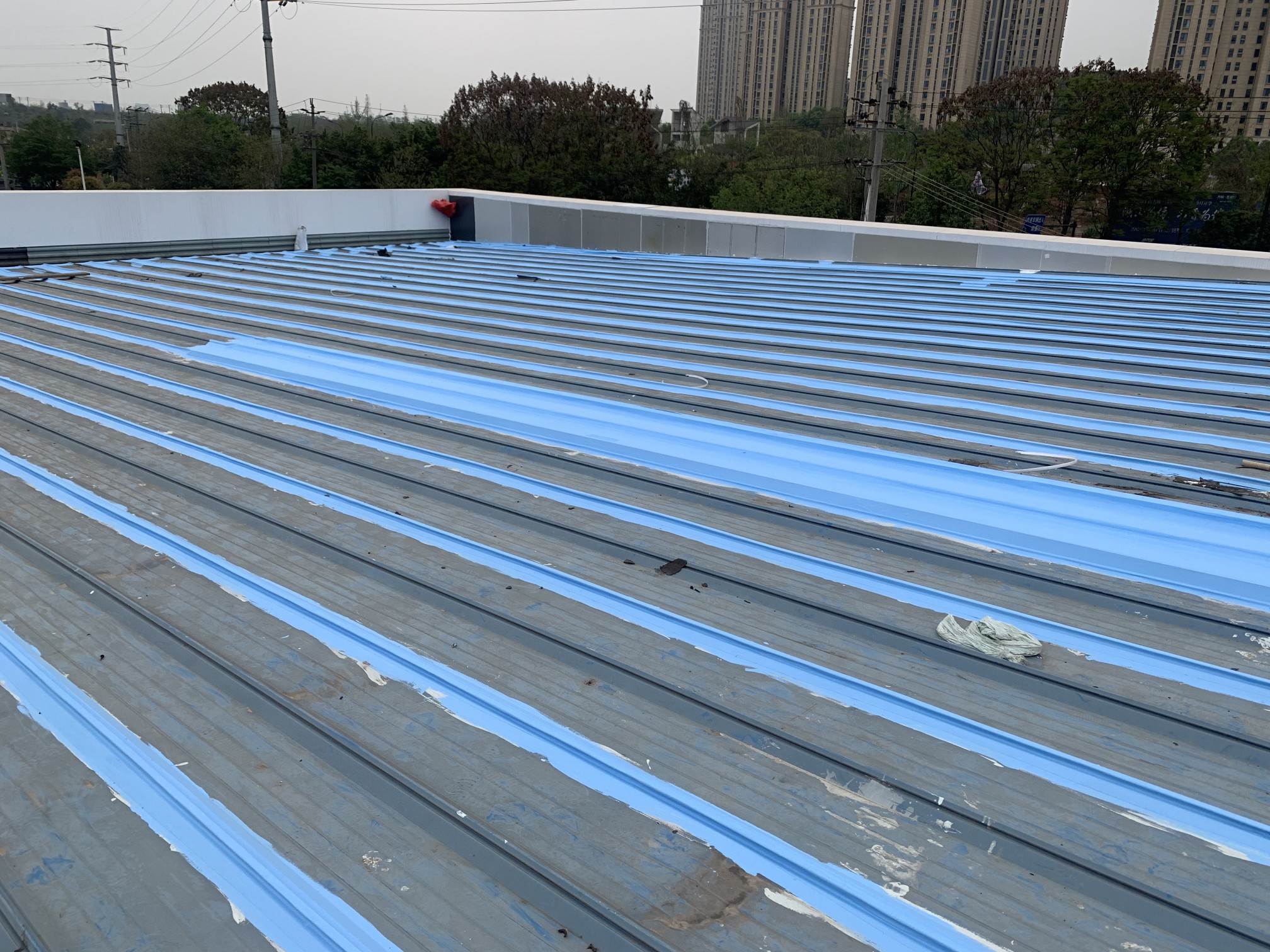 成都市新都區下石橋路啟陽五龍山園區鋼結構彩鋼頂屋面防水補漏由成都蜀禹建筑防水工程有限責任公司施工,采用的蜀禹SYR金屬屋面專用防水涂料配合專用縫織聚酯布進行施工處理的,施工處理后具有防水防腐等多重功能。