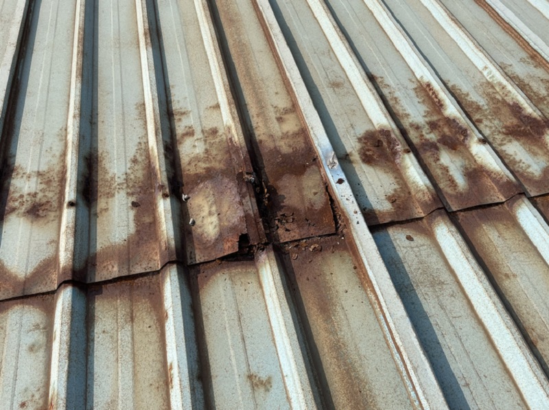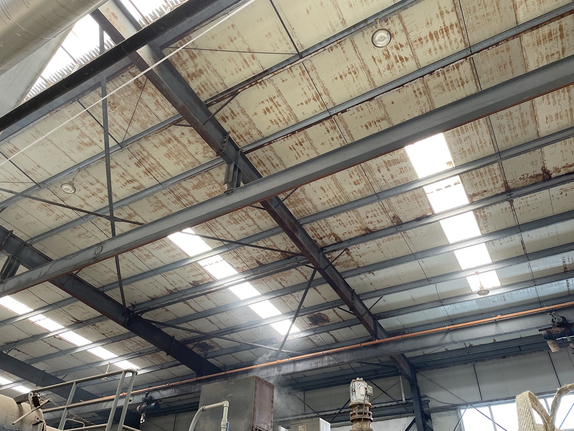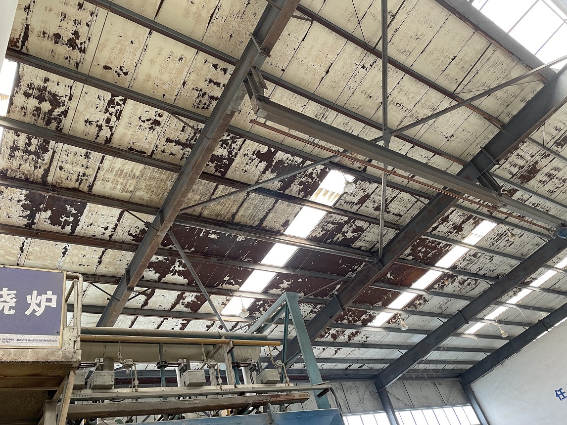 我公司2021年9月施工的位于重慶市潼南區(qū)田家工業(yè)園的重慶遠(yuǎn)達(dá)催化劑綜合利用有限公司彩鋼頂防水,此廠房?jī)?nèi)為生產(chǎn)催化的車(chē)間,氣體具有一定的腐蝕性,導(dǎo)致廠房的彩鋼頂出現(xiàn)了一些銹蝕,彩鋼頂銹蝕情況: