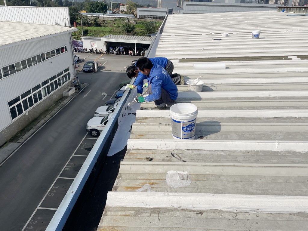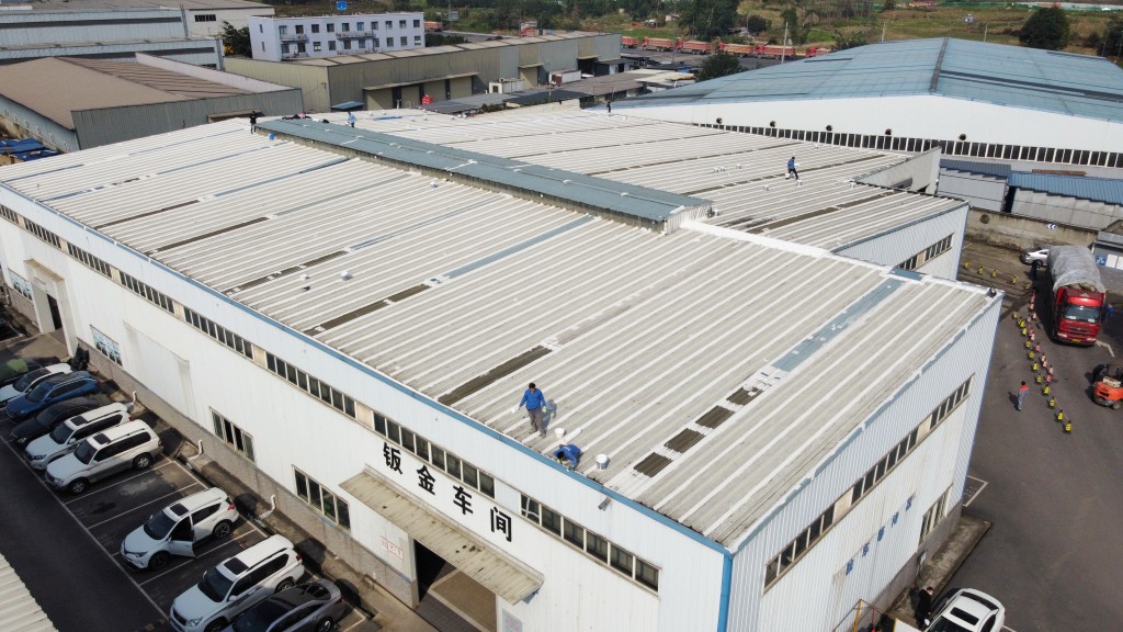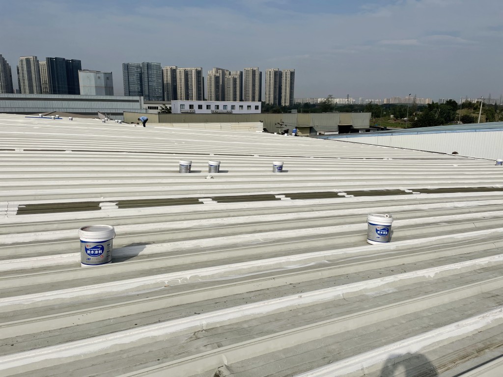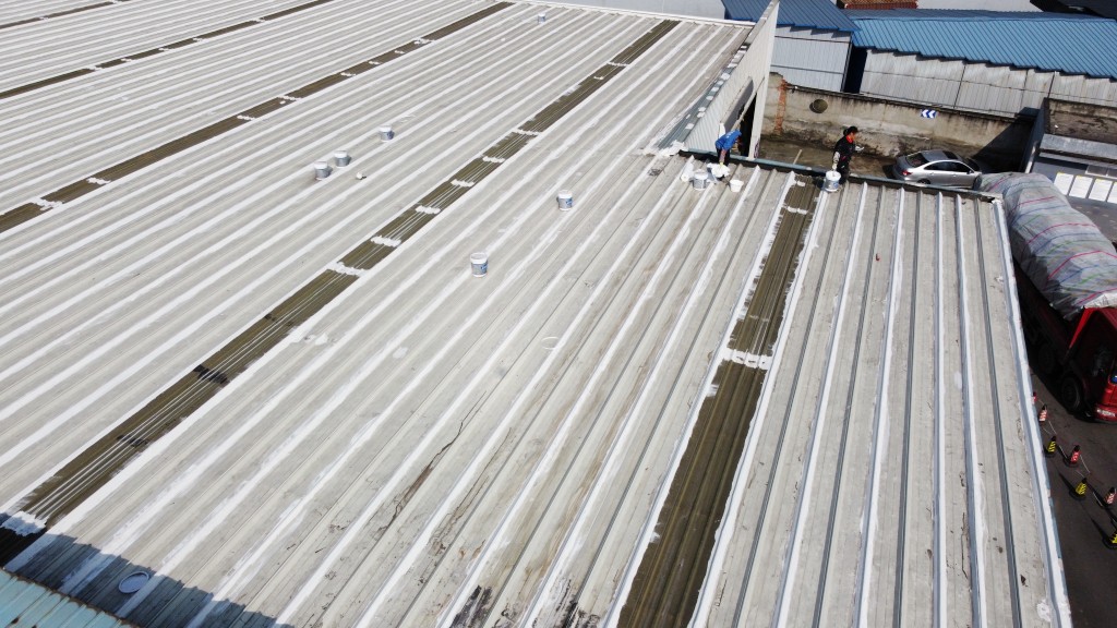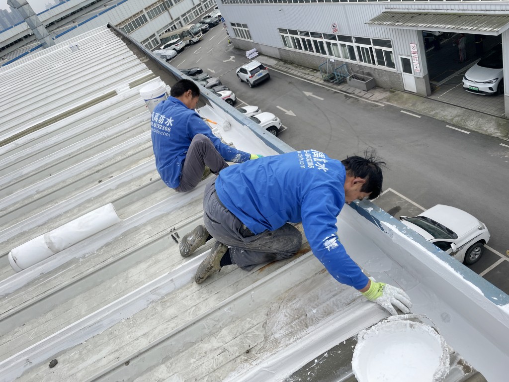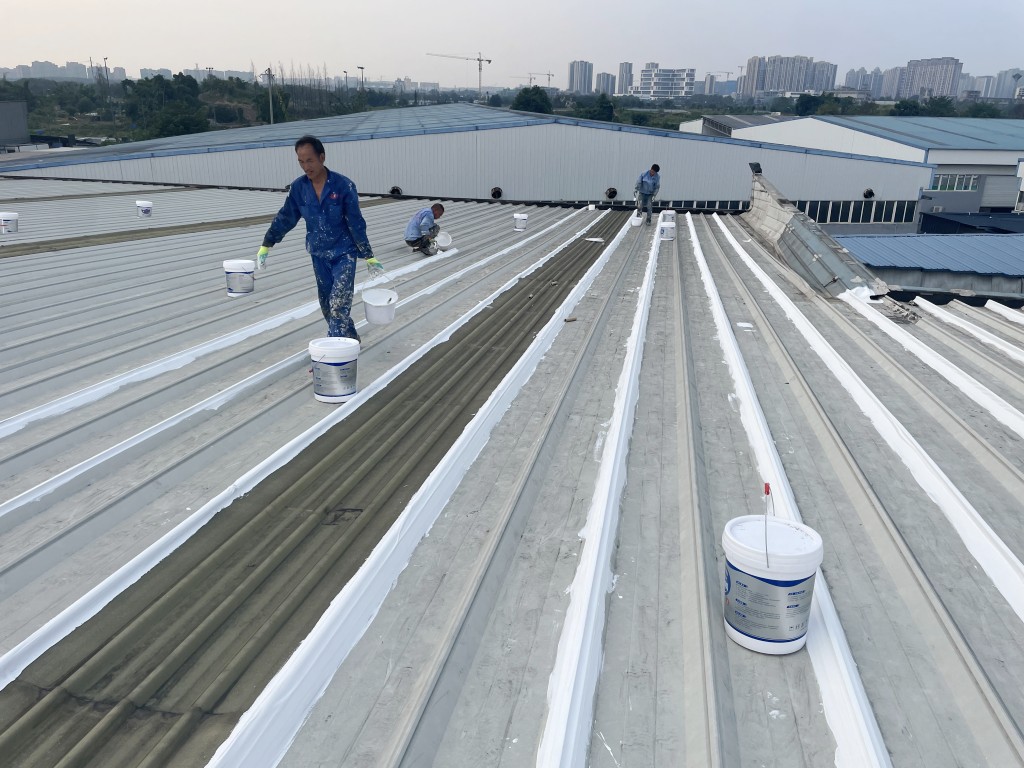 啟陽(yáng)汽車華陽(yáng)園區(qū)豐田鈑金車間與美容區(qū)及洗車區(qū)彩鋼頂防水工程由成都蜀禹建筑防水工程有限責(zé)任公司2021年8月進(jìn)行施工,廠房為鋼結(jié)構(gòu)的彩鋼頂,彩鋼頂漏水點(diǎn)位較多,并且豐田接車雨棚位置一塊區(qū)域彩鋼頂表面生銹了,先針對(duì)彩鋼頂進(jìn)行防水處理之后此處還對(duì)彩鋼表面滿涂SYR金屬屋面防水系統(tǒng)進(jìn)行防銹施工。此次針對(duì)此廠房頂部采用蜀禹SYR金屬屋面專用防水涂料配合專用縫織聚酯布進(jìn)行施工處理,處理后經(jīng)多次下雨檢驗(yàn)驗(yàn)收合格。
