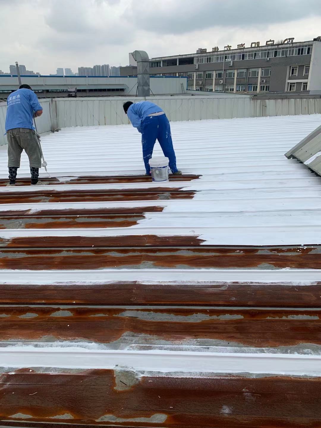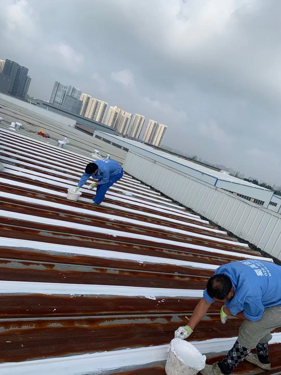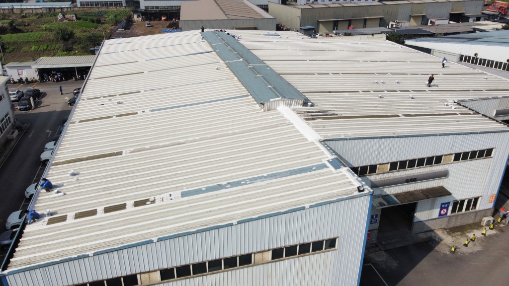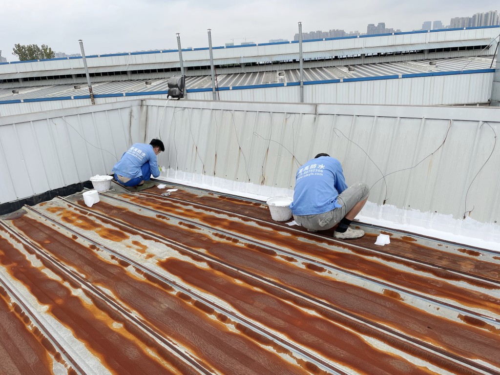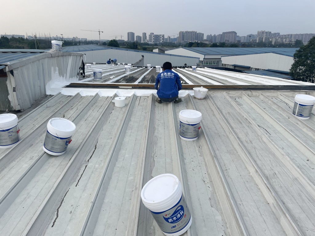 啟陽(yáng)汽車華陽(yáng)園區(qū)豐田鈑金車間與美容區(qū)及洗車區(qū)彩鋼頂防水工程由成都蜀禹建筑防水工程有限責(zé)任公司2021年8月進(jìn)行施工,廠房為鋼結(jié)構(gòu)的彩鋼頂,彩鋼頂漏水點(diǎn)位較多,并且豐田接車雨棚位置一塊區(qū)域彩鋼頂表面生銹了,先針對(duì)彩鋼頂進(jìn)行防水處理之后此處還對(duì)彩鋼表面滿涂SYR金屬屋面防水系統(tǒng)進(jìn)行防銹施工。此次針對(duì)此廠房頂部采用蜀禹SYR金屬屋面專用防水涂料配合專用縫織聚酯布進(jìn)行施工處理,處理后經(jīng)多次下雨檢驗(yàn)驗(yàn)收合格。