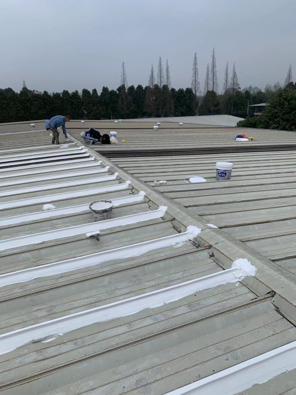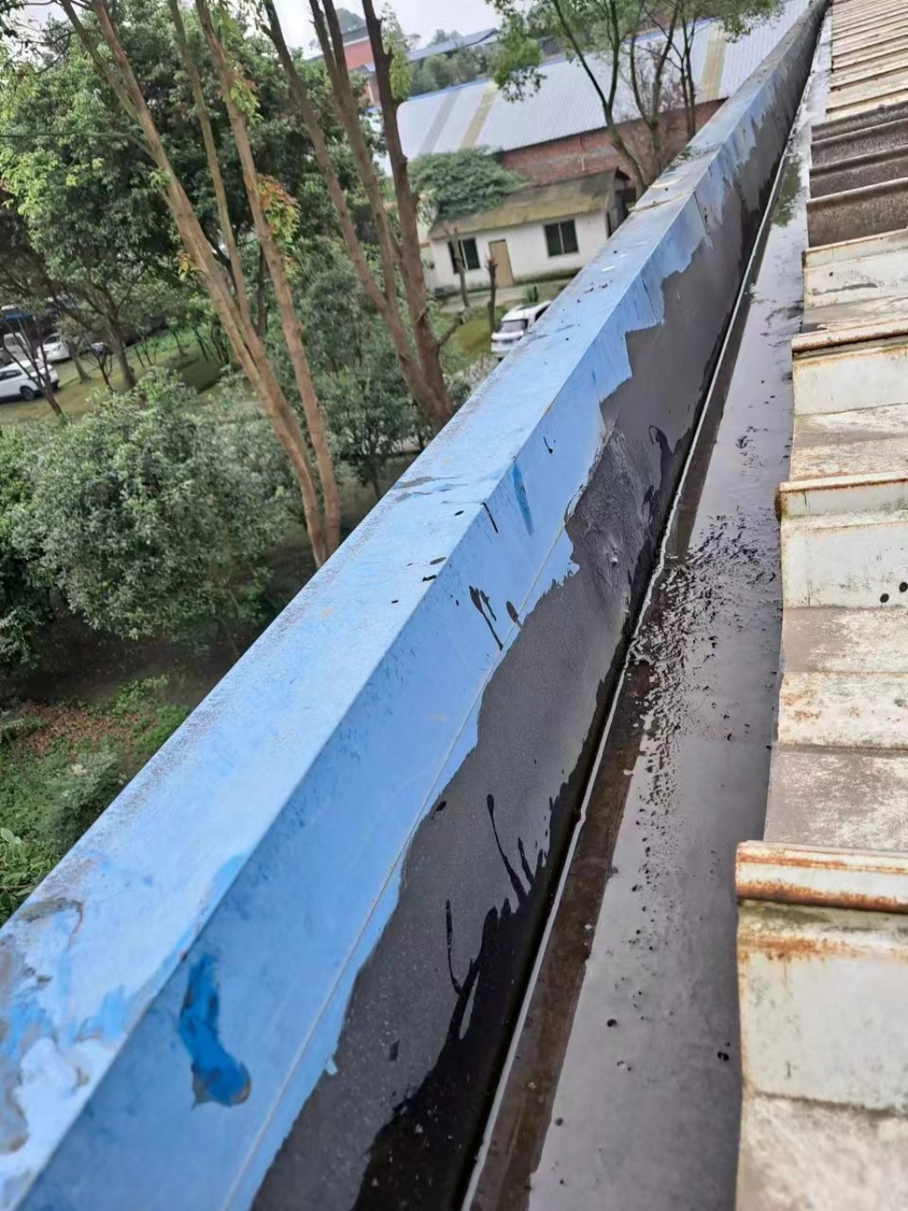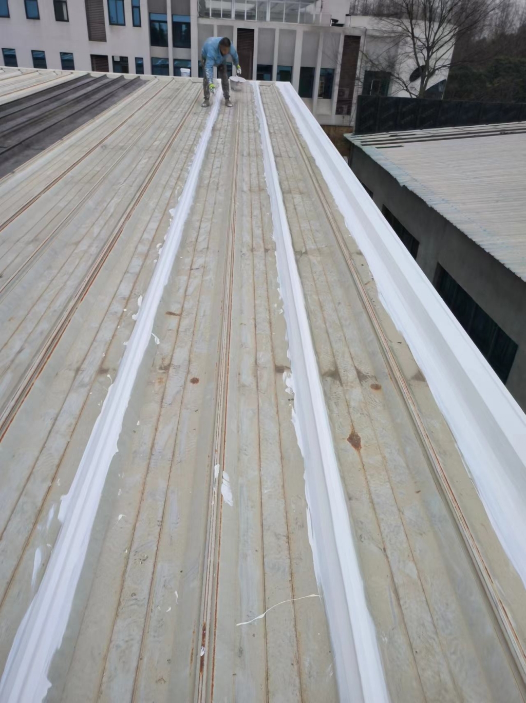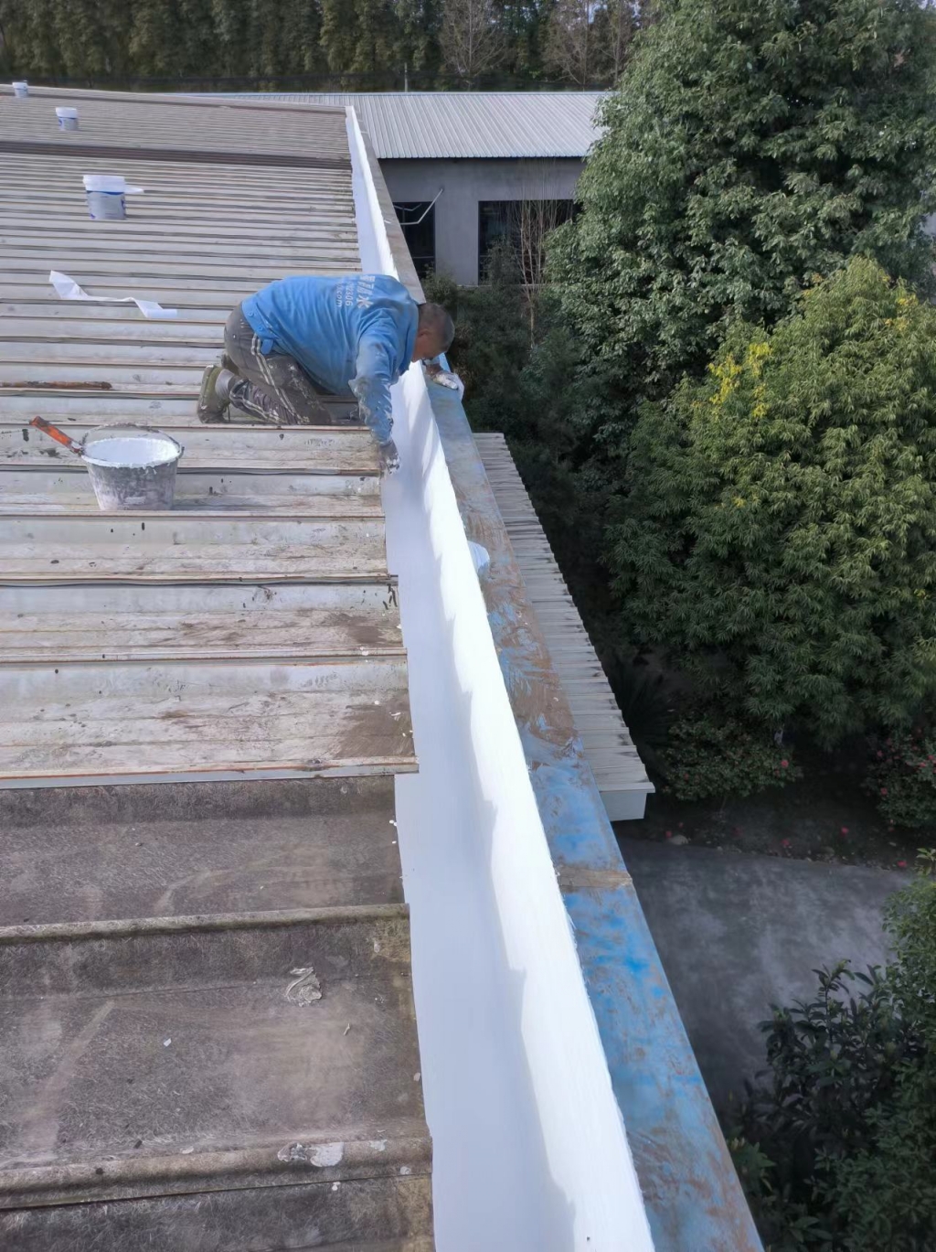 在天溝部位的處理上,成都蜀禹建筑防水工程有限責任公司同樣采用了SYR金屬屋面專用防水涂料進行滿涂刷。對于天溝內銹蝕嚴重的地方,公司首先采用彩鋼板進行修補,然后在生銹的地方涂刷免除銹納米固銹劑進行基面固銹處理。這一步驟不僅有效去除了銹蝕,還為后續的防水防腐處理奠定了堅實的基礎。