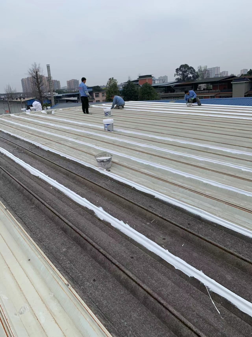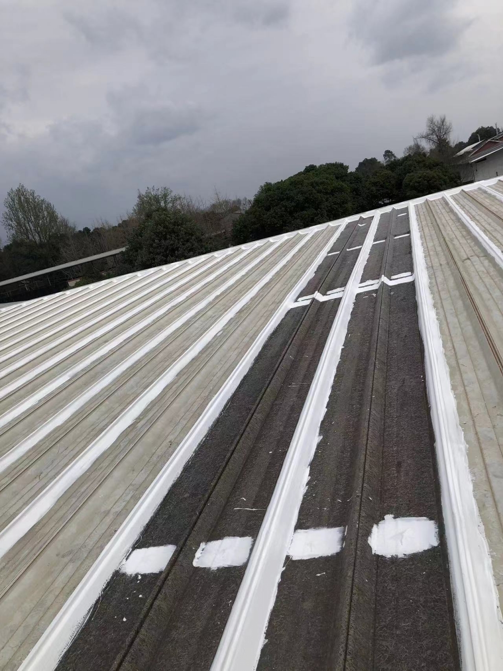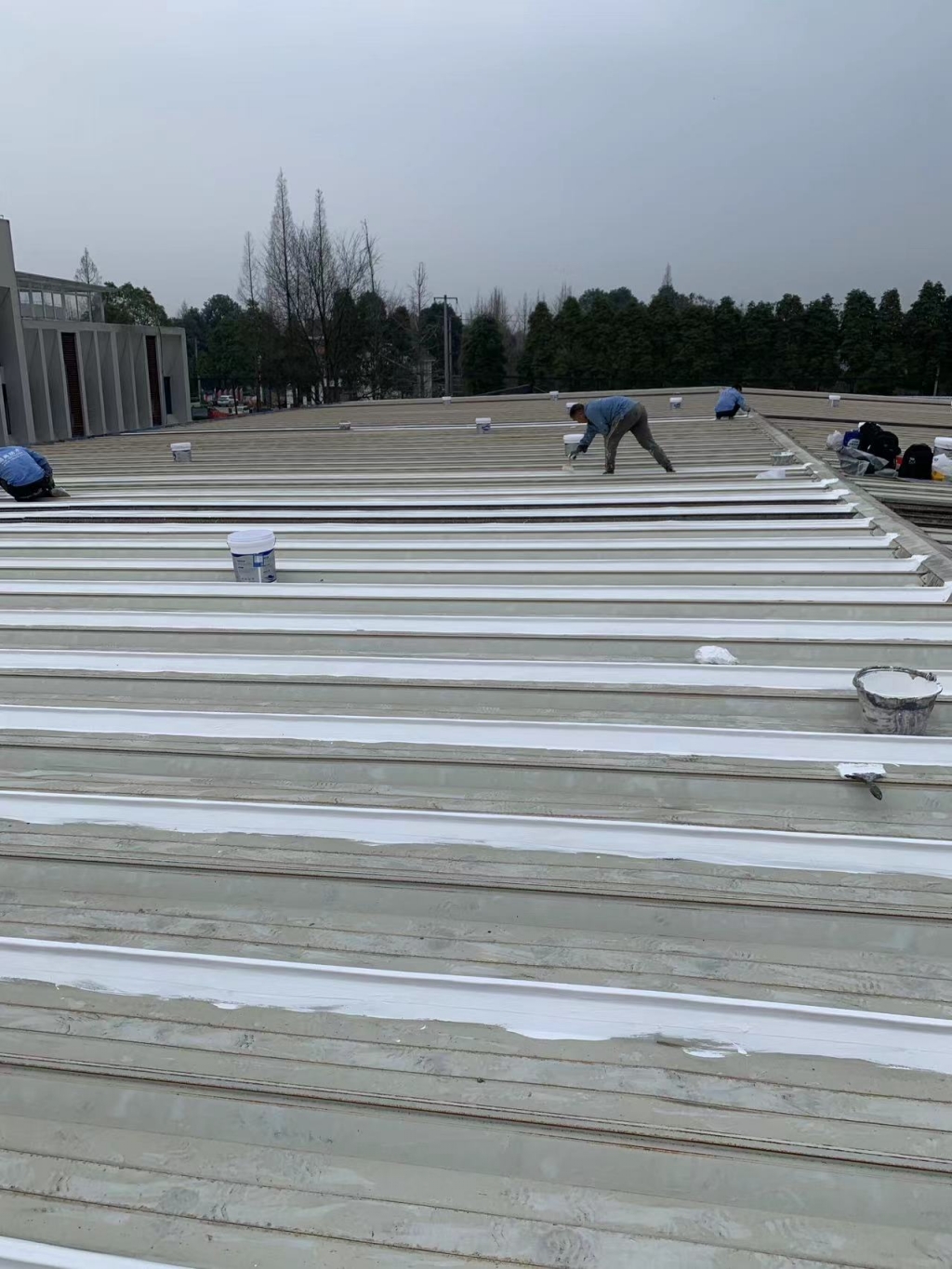 在天溝部位的處理上,成都蜀禹建筑防水工程有限責任公司同樣采用了SYR金屬屋面專用防水涂料進行滿涂刷。對于天溝內銹蝕嚴重的地方,公司首先采用彩鋼板進行修補,然后在生銹的地方涂刷免除銹納米固銹劑進行基面固銹處理。這一步驟不僅有效去除了銹蝕,還為后續的防水防腐處理奠定了堅實的基礎。
