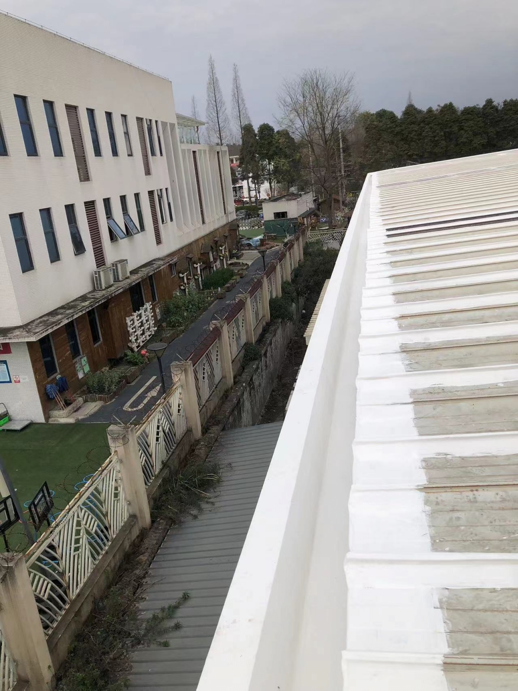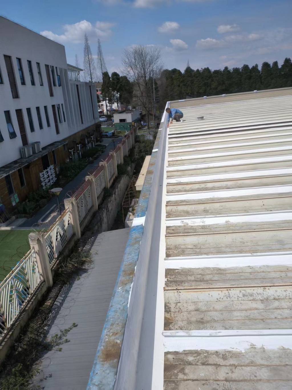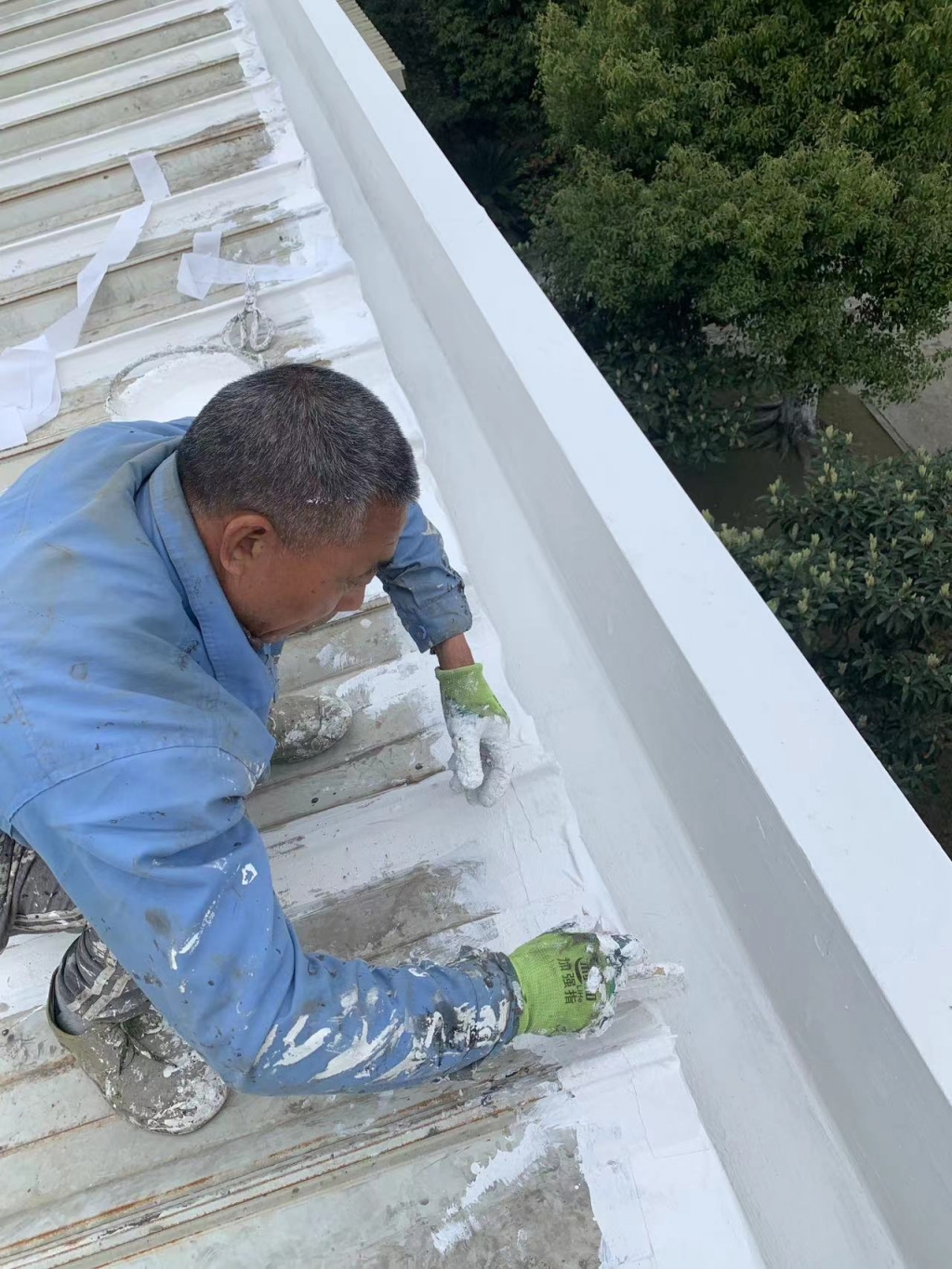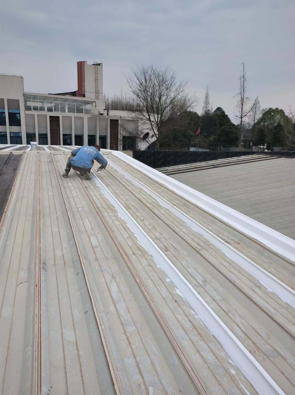 在天溝部位的處理上,成都蜀禹建筑防水工程有限責任公司同樣采用了SYR金屬屋面專用防水涂料進行滿涂刷。對于天溝內銹蝕嚴重的地方,公司首先采用彩鋼板進行修補,然后在生銹的地方涂刷免除銹納米固銹劑進行基面固銹處理。這一步驟不僅有效去除了銹蝕,還為后續的防水防腐處理奠定了堅實的基礎。