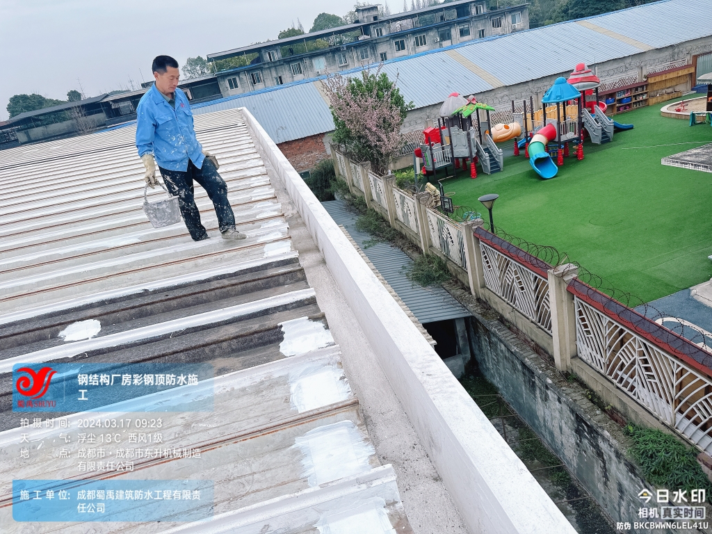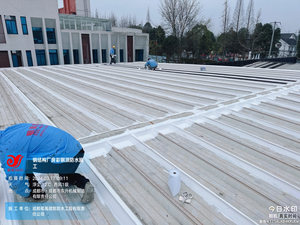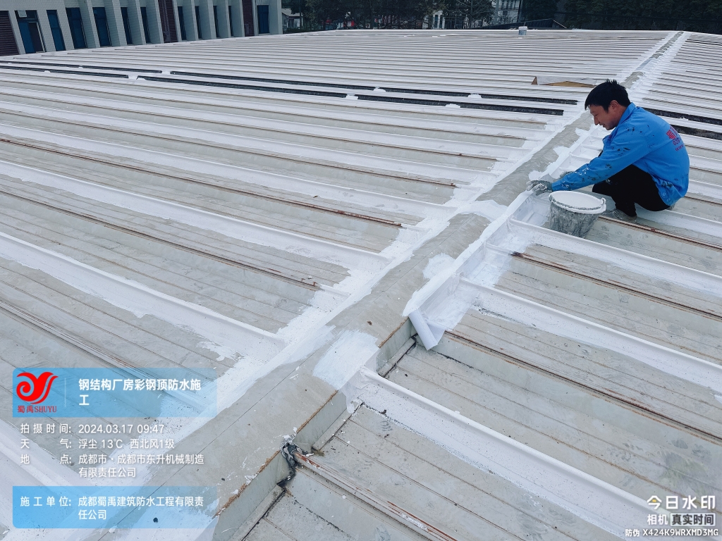 近日,成都蜀禹建筑防水工程有限責任公司成功完成了成都市東升機械制造有限責任公司位于溫江區廠房的彩鋼頂及天溝防水補漏工程。此次工程旨在解決廠區內廠房彩鋼頂屋頂表面的彩鋼瓦接縫、固定螺釘、天溝等部位的防水問題,確保廠房的防水性能得到有效提升。